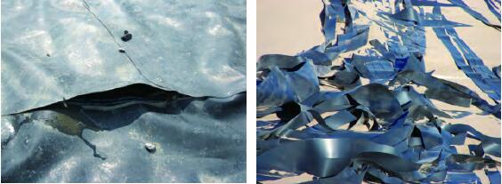 土工膜在運(yùn)輸、安裝和運(yùn)行過(guò)程中會(huì)產(chǎn)生破損,破損的土工膜造成防滲系統(tǒng)失效,產(chǎn)生環(huán)境污染事件。采用回料生產(chǎn)的土工膜質(zhì)量差,被大量應(yīng)用于垃圾填埋場(chǎng),對(duì)填埋場(chǎng)的安全運(yùn)行帶來(lái)巨大隱患。