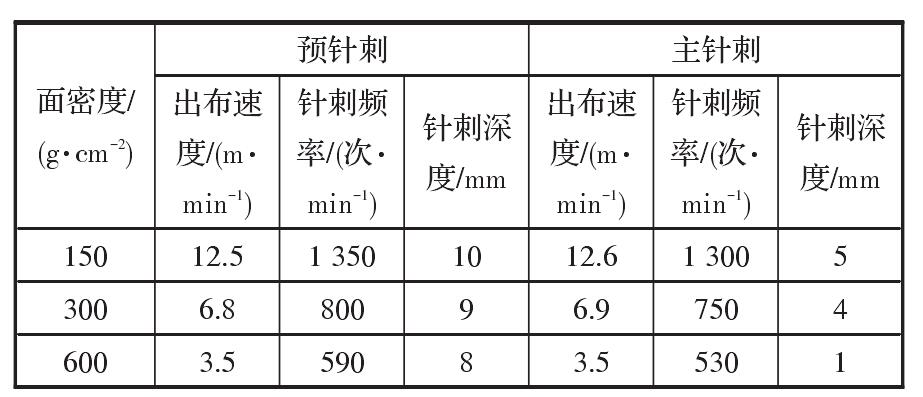 針刺頻率和針刺深度對布面強力有重要的影響。對于高強滌綸紡黏針刺土工布來講,布的面密度越大,生產(chǎn)速度越慢,針刺頻率越低;面密度偏小時,針刺工藝正好相反。針刺深度調(diào)整原則如下:①單絲強力較高時,針刺深度深一些;②面密度較大時,針刺深度淺一些;③預(yù)針刺深度比主針刺深一些。