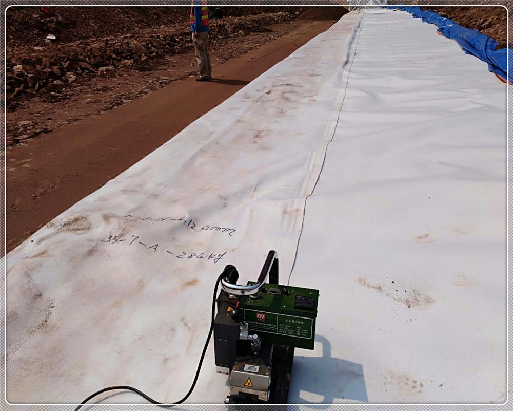 樞紐主要由復(fù)合土工膜堆石壩、溢洪道、引水發(fā)電系統(tǒng)、放空洞組成。復(fù)合土工膜堆石壩壩高85m,為高比例(達(dá)81%)軟巖填筑,軟巖填筑比例在同類型壩中世界之高。大壩防滲體采用復(fù)合土工膜防滲面板。土工膜之間的焊接和土工膜在錨帶部位的焊接,兩部位均采用熱風(fēng)粘合的方式。土工膜與土工膜之間的焊接采用全自動風(fēng)焊機進行,焊接帶的寬度為65mm,中間留有15mm的檢查氣孔,兩側(cè)各有25mm寬的粘合段。